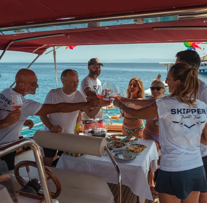 Dopo aver navigato attorno alle coste dell'arcipelago, vi verrà offerto dallo staff un aperitivo a base di prodotti tipici locali da consumare a bordo dell'imbarcazione.