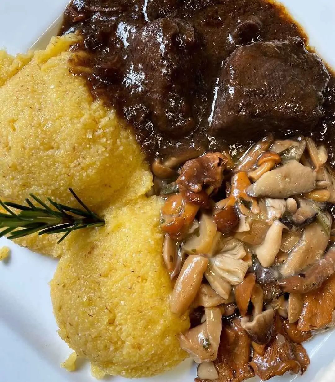 Il rifugio offre piatti tipici della cucina trentina, come i canederli con lo speck o la polenta con cervo e funghi.
