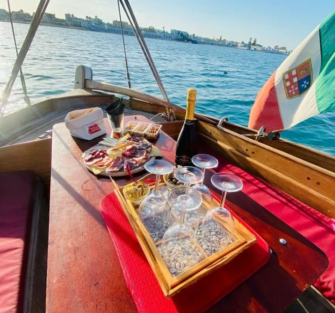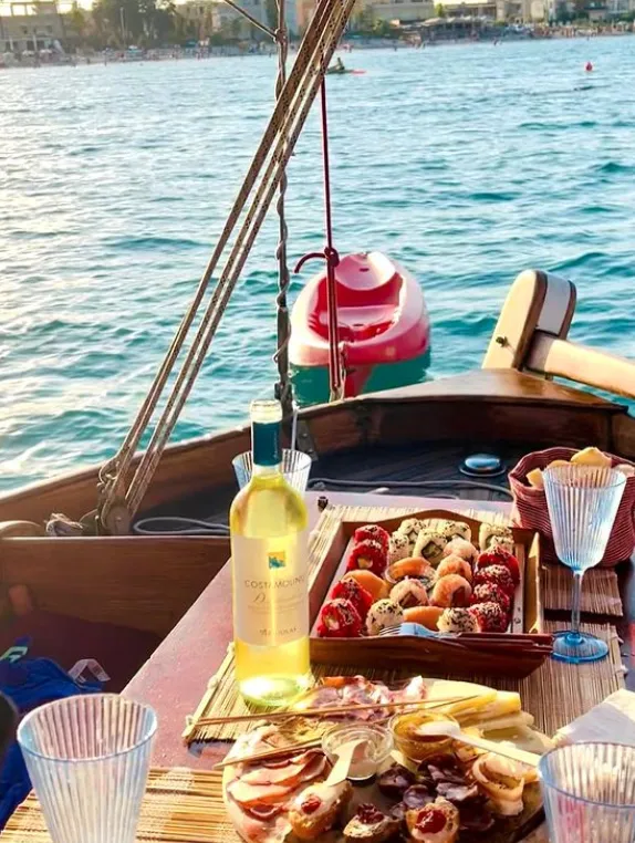 Questa proposta offre una navigazione in barca per ammirare il tramonto sulla spiaggia del Poetto, accompagnata da un aperitivo che include bollicine ghiacciate e prodotti della gastronomia sarda come olive, formaggi e salumi. Su richiesta, è disponibile anche un assortimento di sushi e frutti di mare.