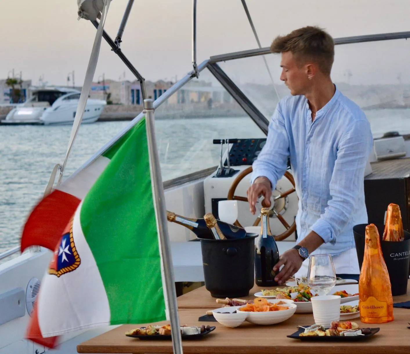 Dopo aver concluso la prima sosta bagno, ovviamente senza nessun limite tempistico, la seconda tappa è Baia di Vignanotica dove ci sarà una seconda sosta bagno. Proprio in questa baia avverrà il pranzo composto da prodotti freschi tipici locali (prodotti di mare e di terra) preparati a bordo, accompagnati con dell’ottimo prosecco fresco. Per chi non beve alcool sarà messo a disposizione tè alla pesca, al limone e acqua.