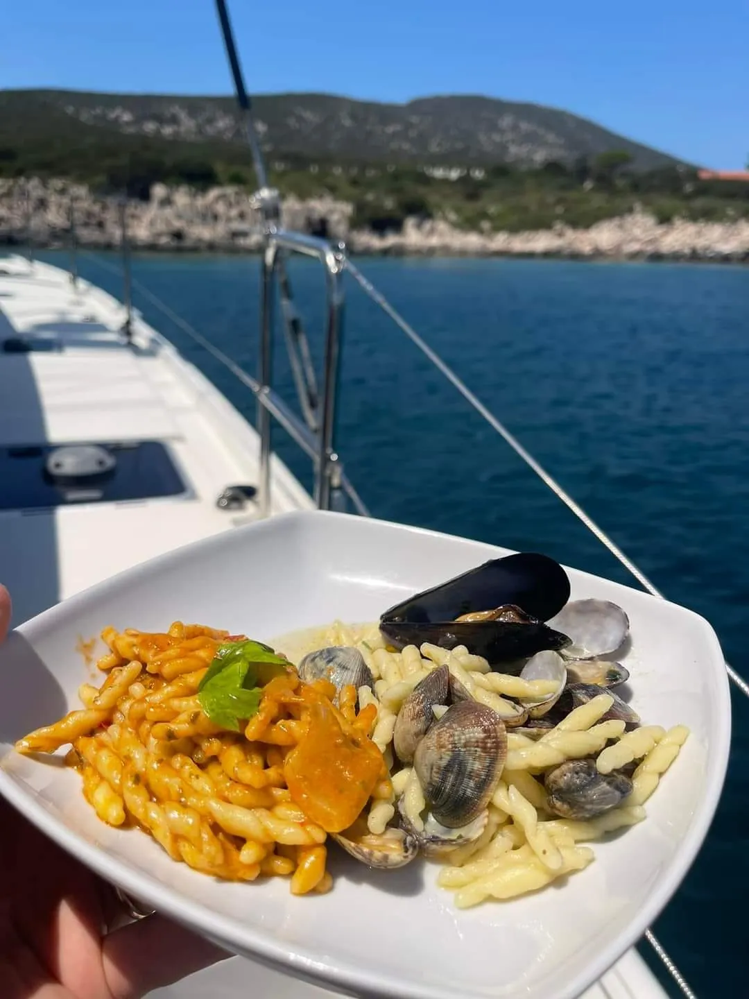 Il pranzo include prodotti tipici come aperitivi di salsiccia e formaggio, bruschette e pasta ai frutti di mare, con opzioni al pesto o semplice al pomodoro fresco.