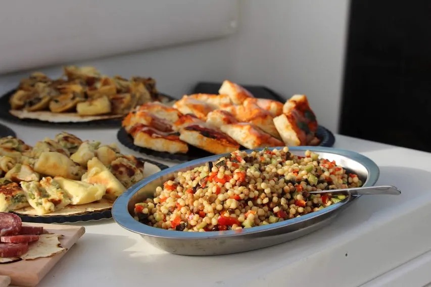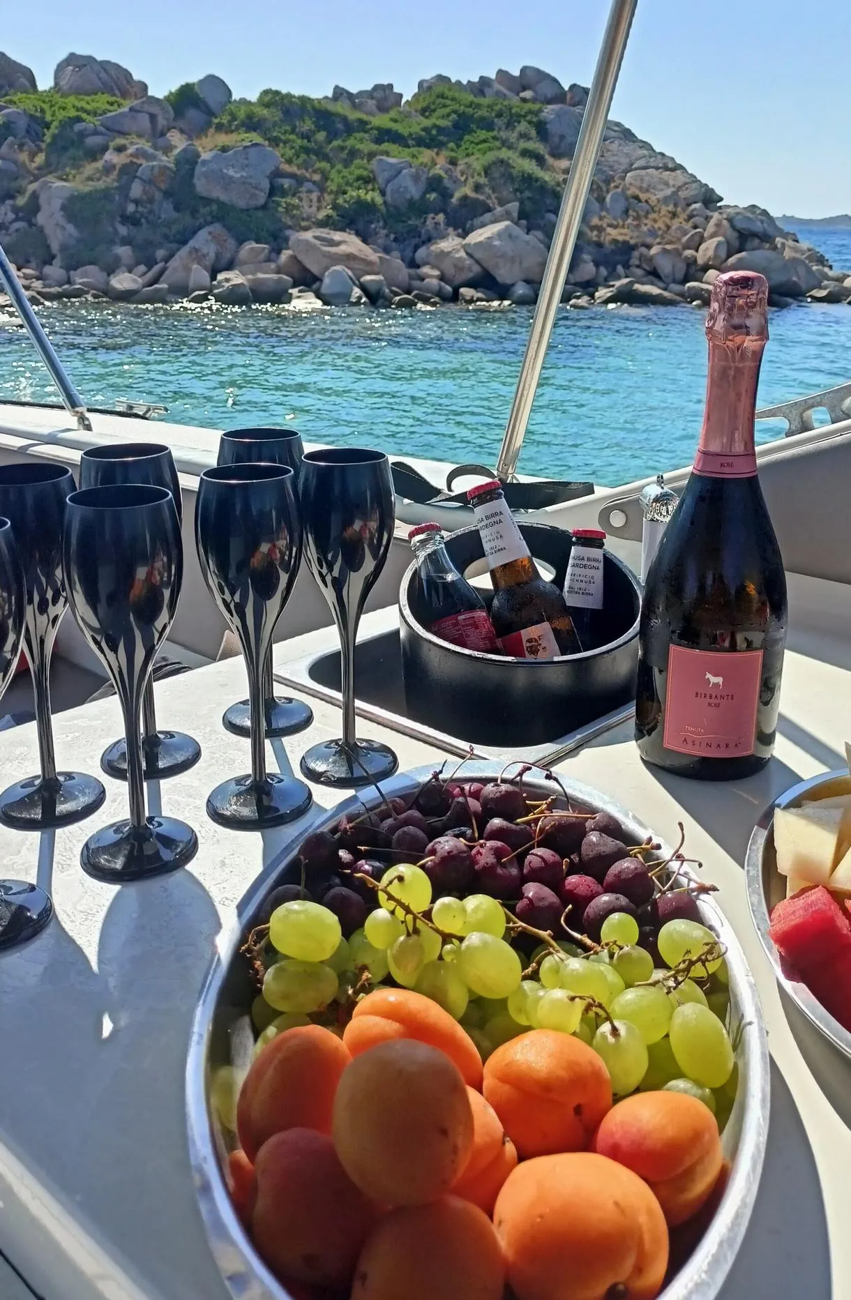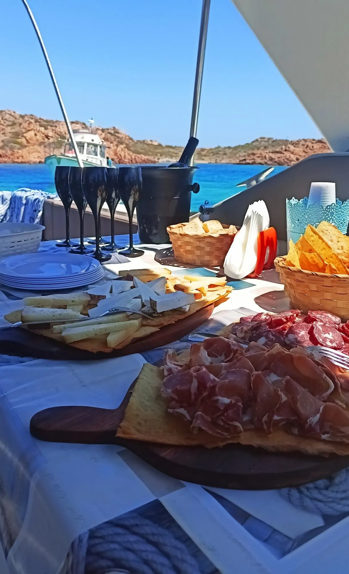 Il pranzo servito a bordo include antipasto sardo, fregola sarda, vino di Gallura, caffè, dolce, frutta e spumante, tutto incluso nel prezzo. Il costo del carburante è compreso.