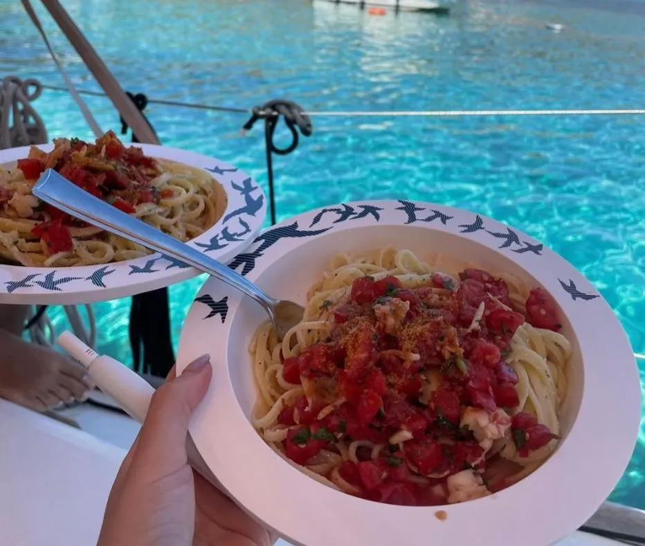 Il pranzo è incluso, a base di prodotti locali e viene servito a bordo in una delle cale dell’isola. È composto da un antipasto, un primo, vermentino, della frutta, caffè e digestivo.