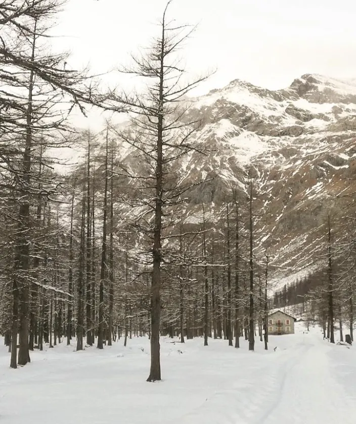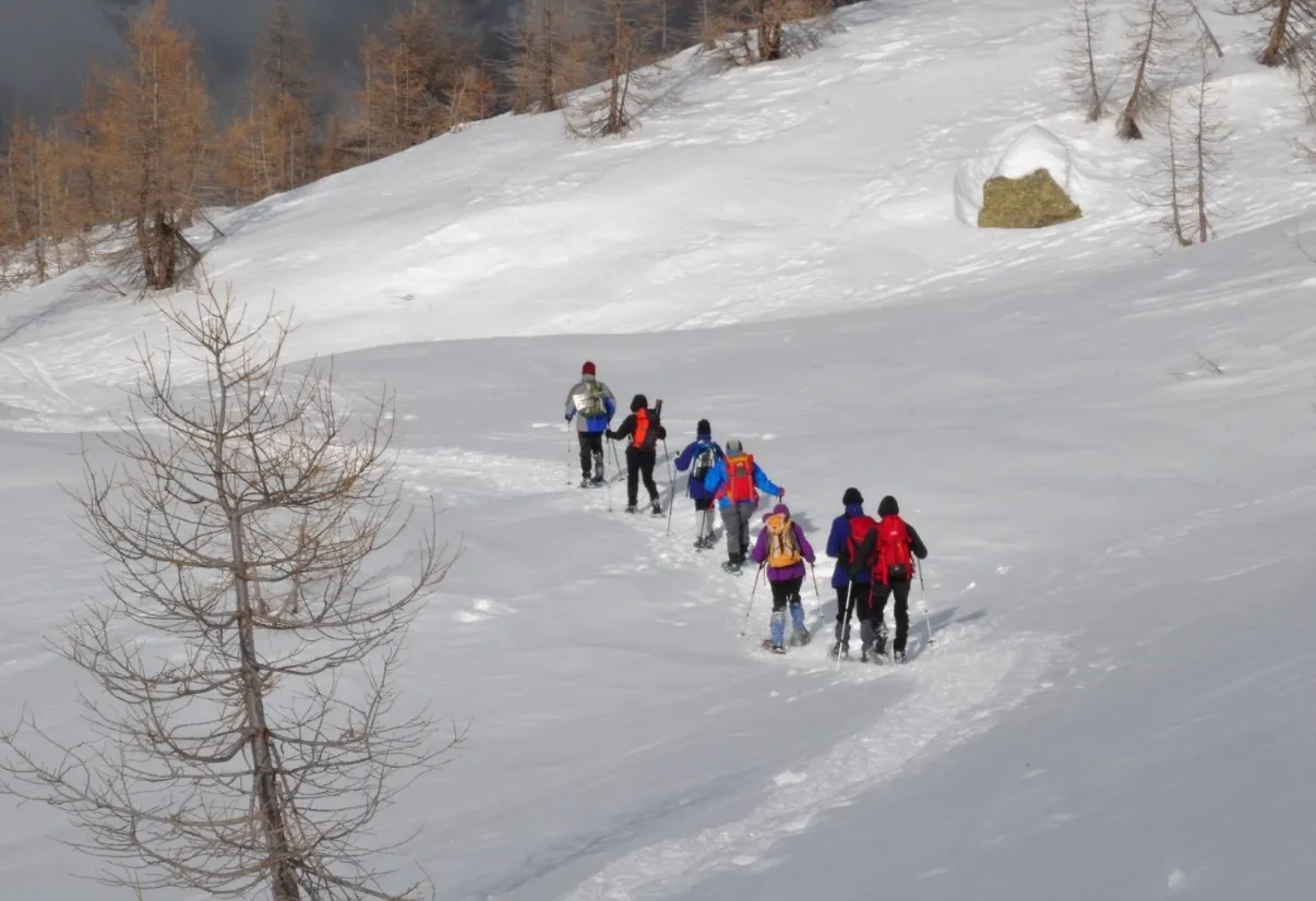 Alle 8.30 dal punto d'incontro raggiungerete Borgata Montone a 1538m, dove l'esperienza ha effettivamente inizio. La gita di circa 5.5 chilometri continua dirigendovi verso l'Alpe Cà Bianca a 1942m percorrendo un magico lariceto innevato.