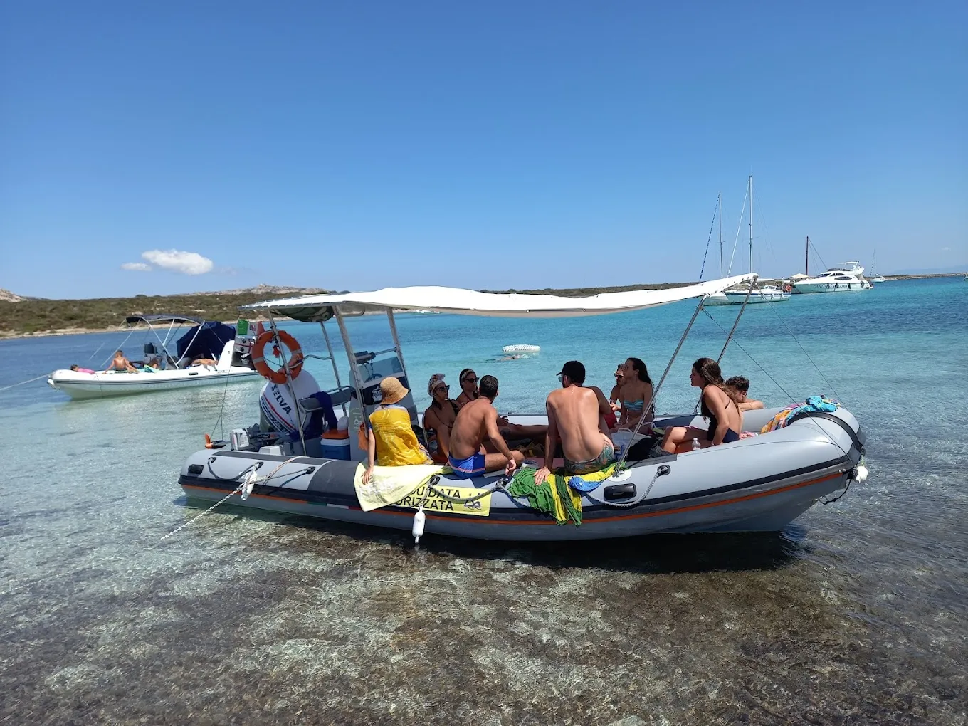 L'escursione in gommone elettrico include un aperitivo a bordo a base di salsiccia, formaggio e pane grattiau, accompagnati da vino o birra. La navigazione può essere organizzata in condivisione oppure in esclusiva e dura un'intera giornata.