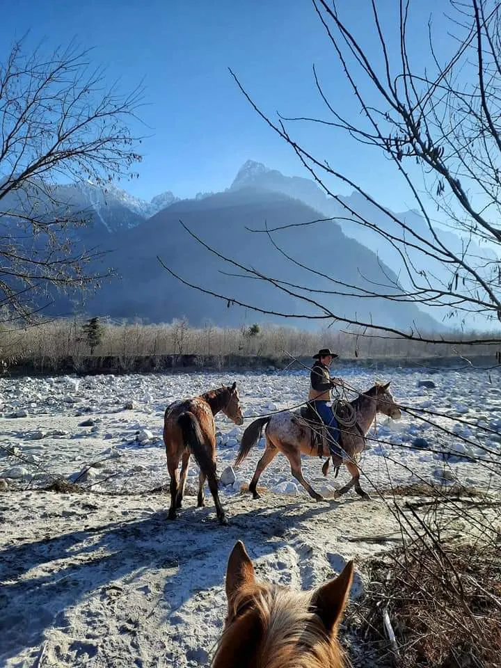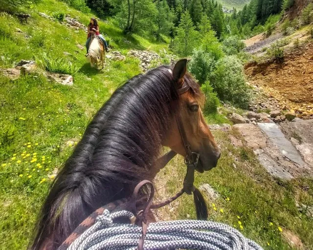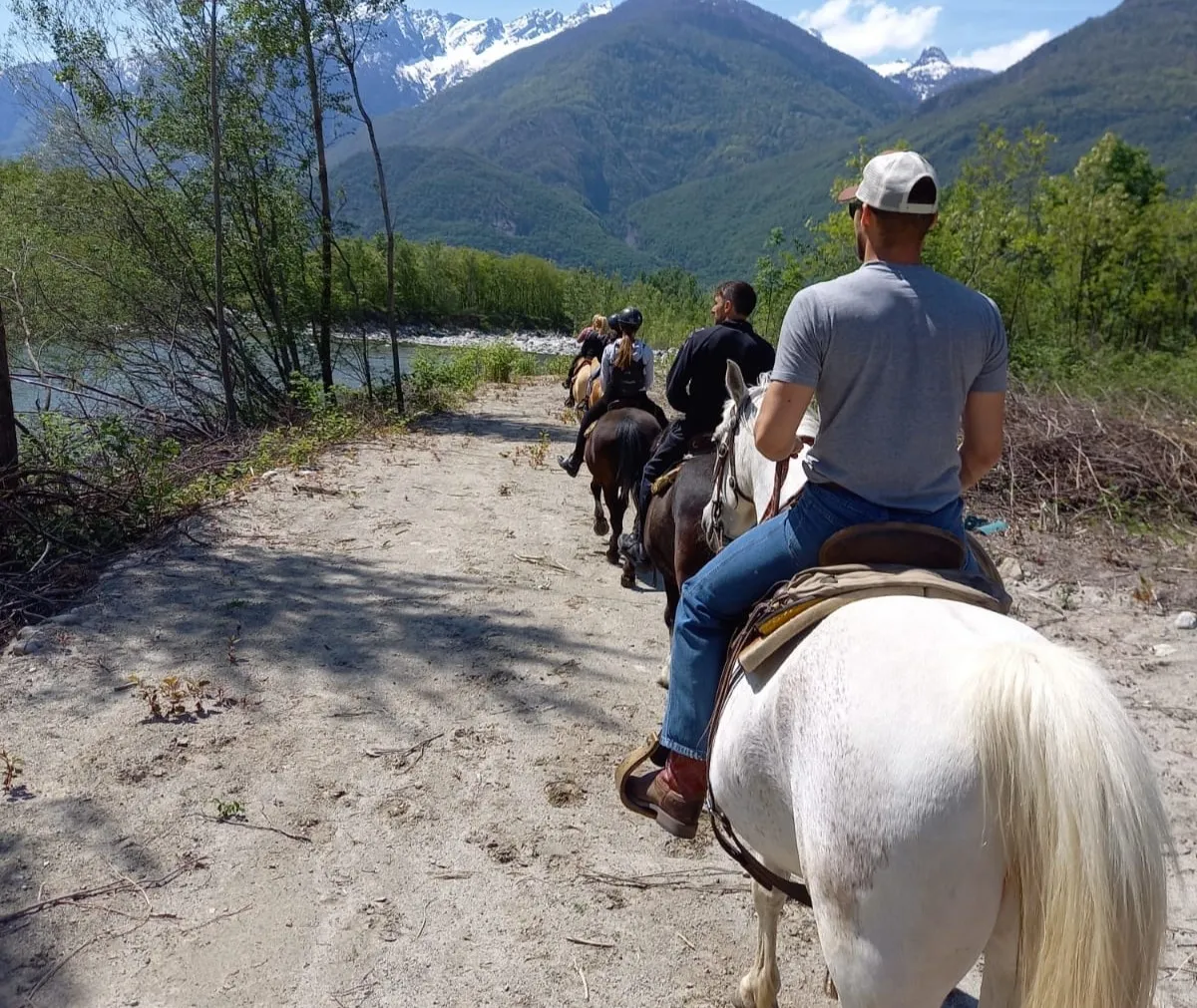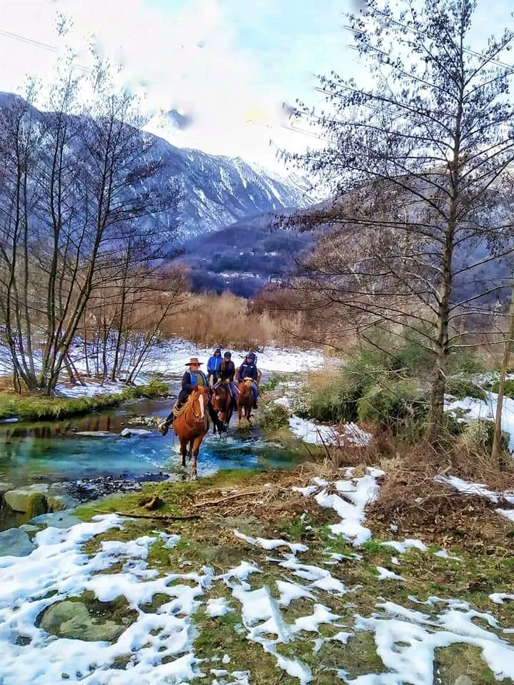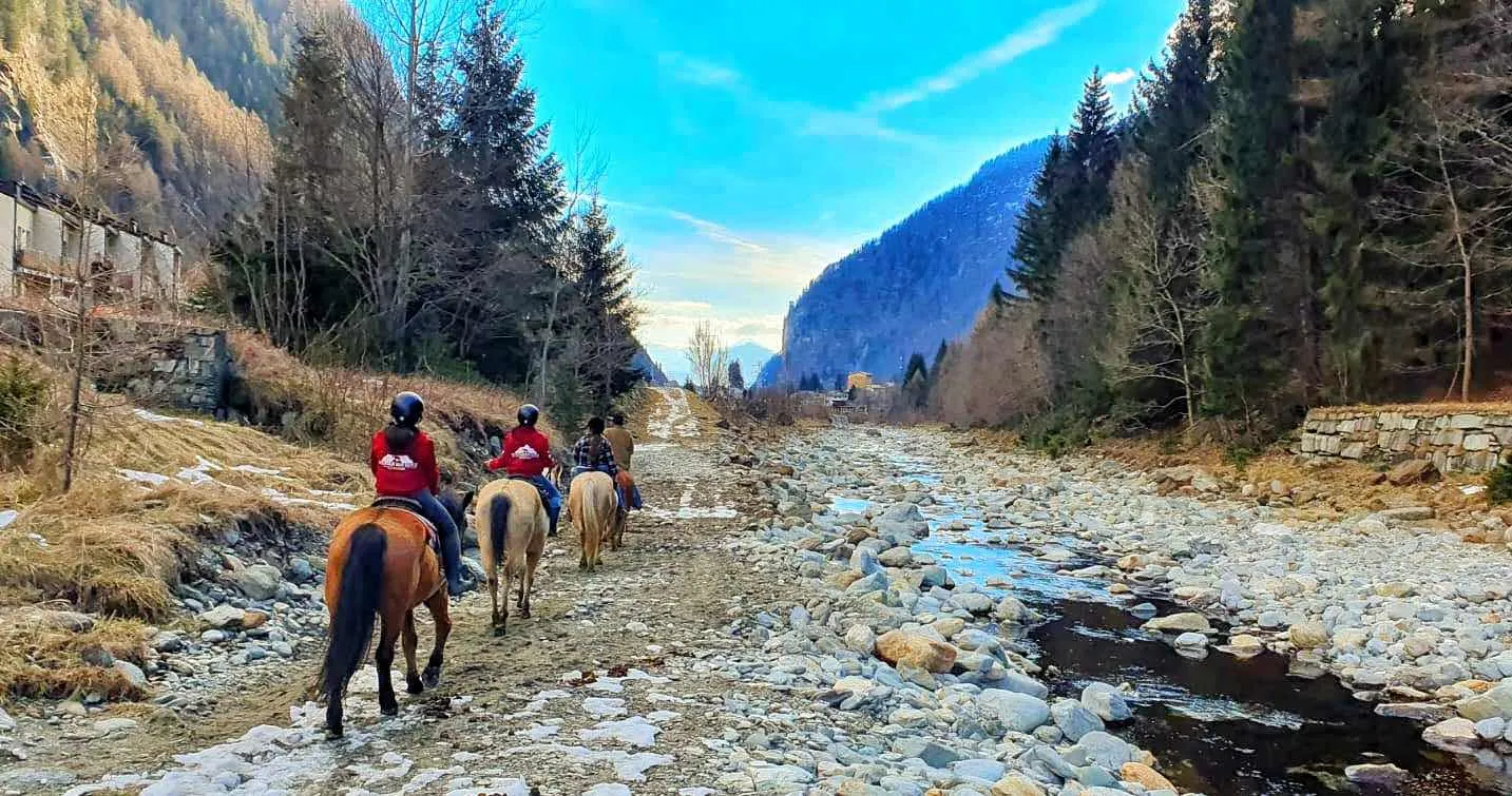 Una fantastica passeggiata a cavallo lungo gli argini del fiume Mera, in Valchiavenna, ai piedi delle montagne.