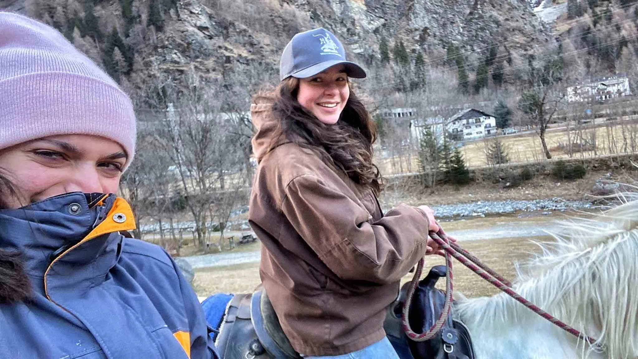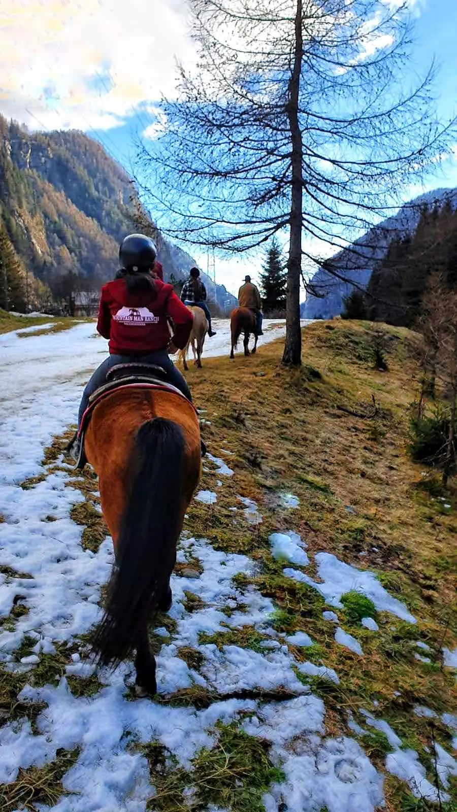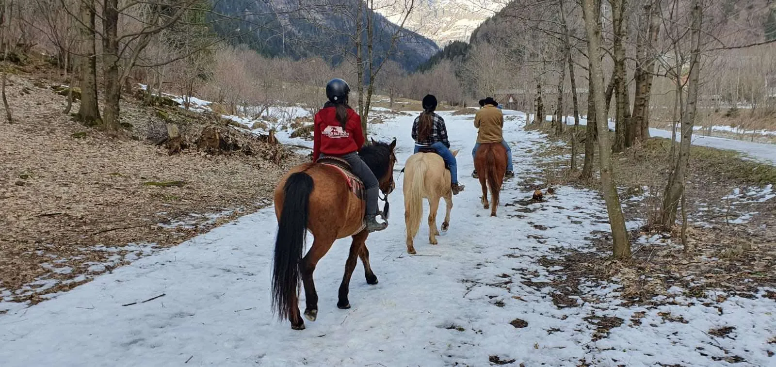 Una fantastica passeggiata a cavallo lungo gli argini del fiume Mera, in Valchiavenna, ai piedi delle montagne.