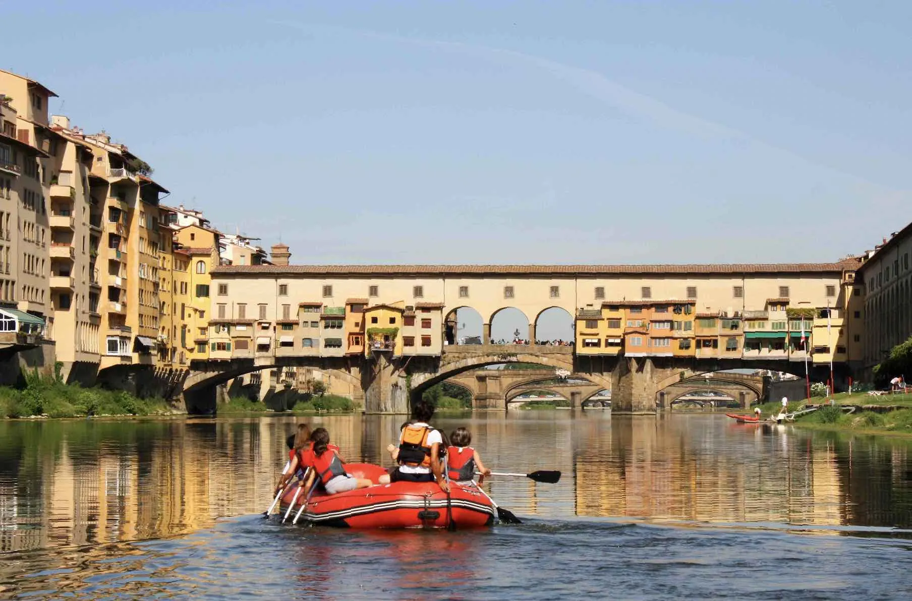 Durante l'esperienza di rafting sull'Arno da Firenze con aperitivo potrete navigare lungo l'Arno e ammirare da una prospettiva diversa il centro storico, tra cui il famoso Ponte Vecchio, la Galleria degli Uffizi e il Corridoio Vasariano, il tutto comodamente seduti su un gommone.