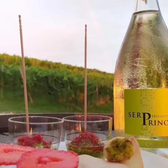 La degustazione avviene sul terrazzo panoramico della cantina, che offre una splendida vista sui Colli Euganei. La degustazione include 5 vini: