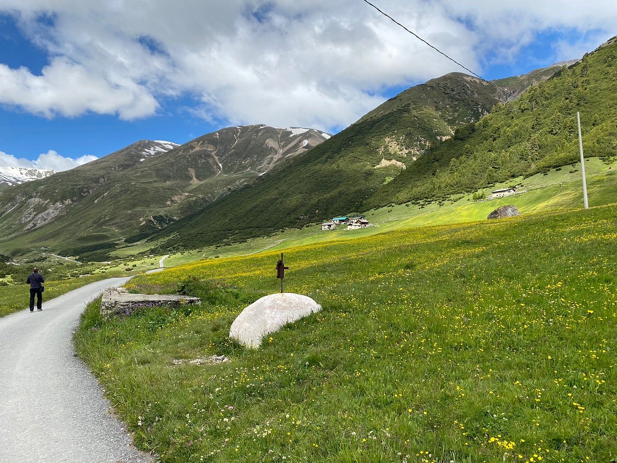 Partendo dalla cima, si scende nella valle lungo una strada bianca che corre lungo il pendio della montagna, tra pascoli e prati dove è possibile avvistare le marmotte che, se si fa silenzio, si fanno avvicinare dai turisti di passaggio. Per questo motivo, a Livigno è anche conosciuto come sentiero delle marmotte.